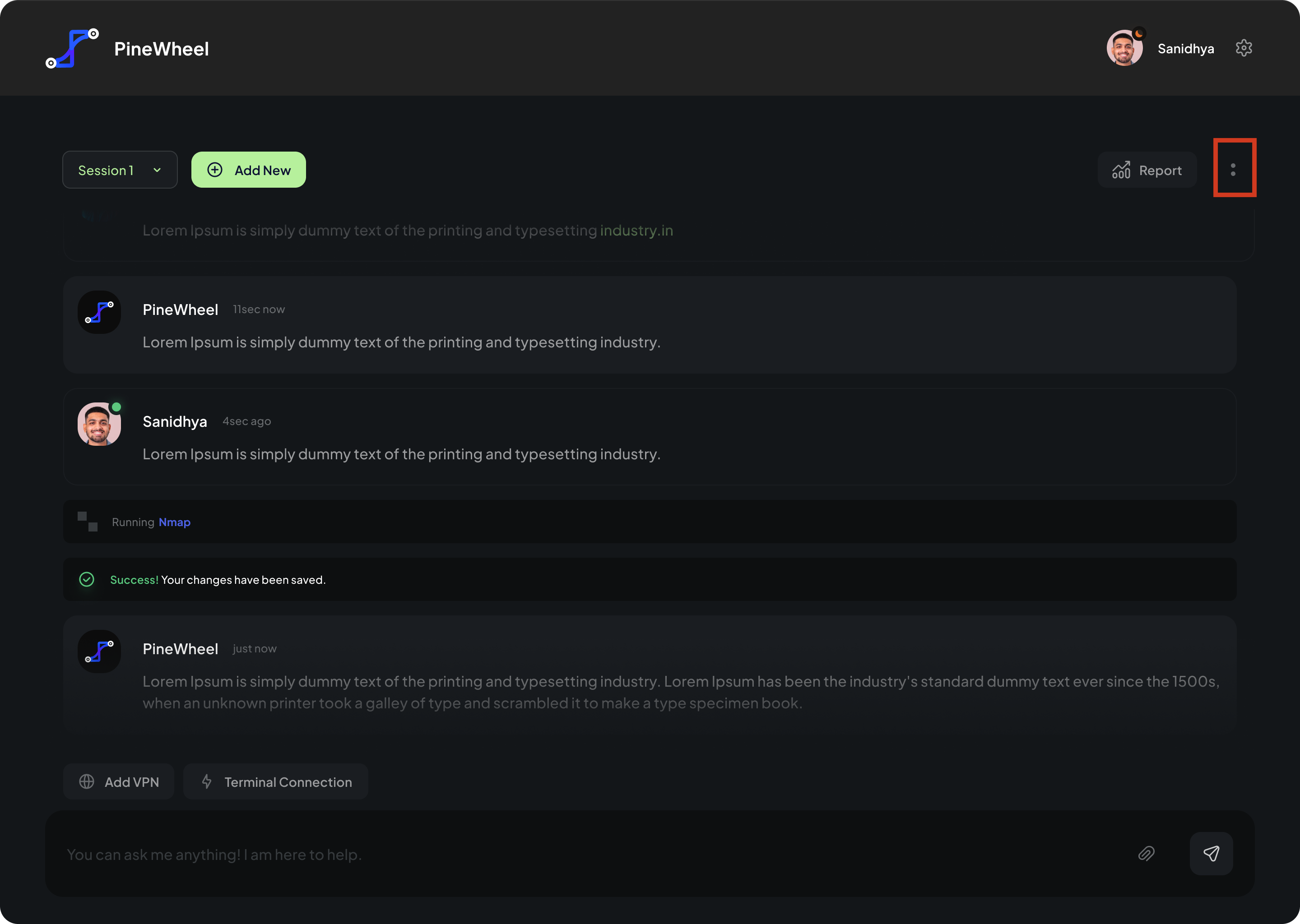The Chat Assistant feature in Pinewheel Copilot is an intuitive chat interface designed to streamline your penetration testing process. It allows you to seamlessly interact with various tools, access Burp Suite plugins, and generate live reports in response to your prompts specific to penetration testing.